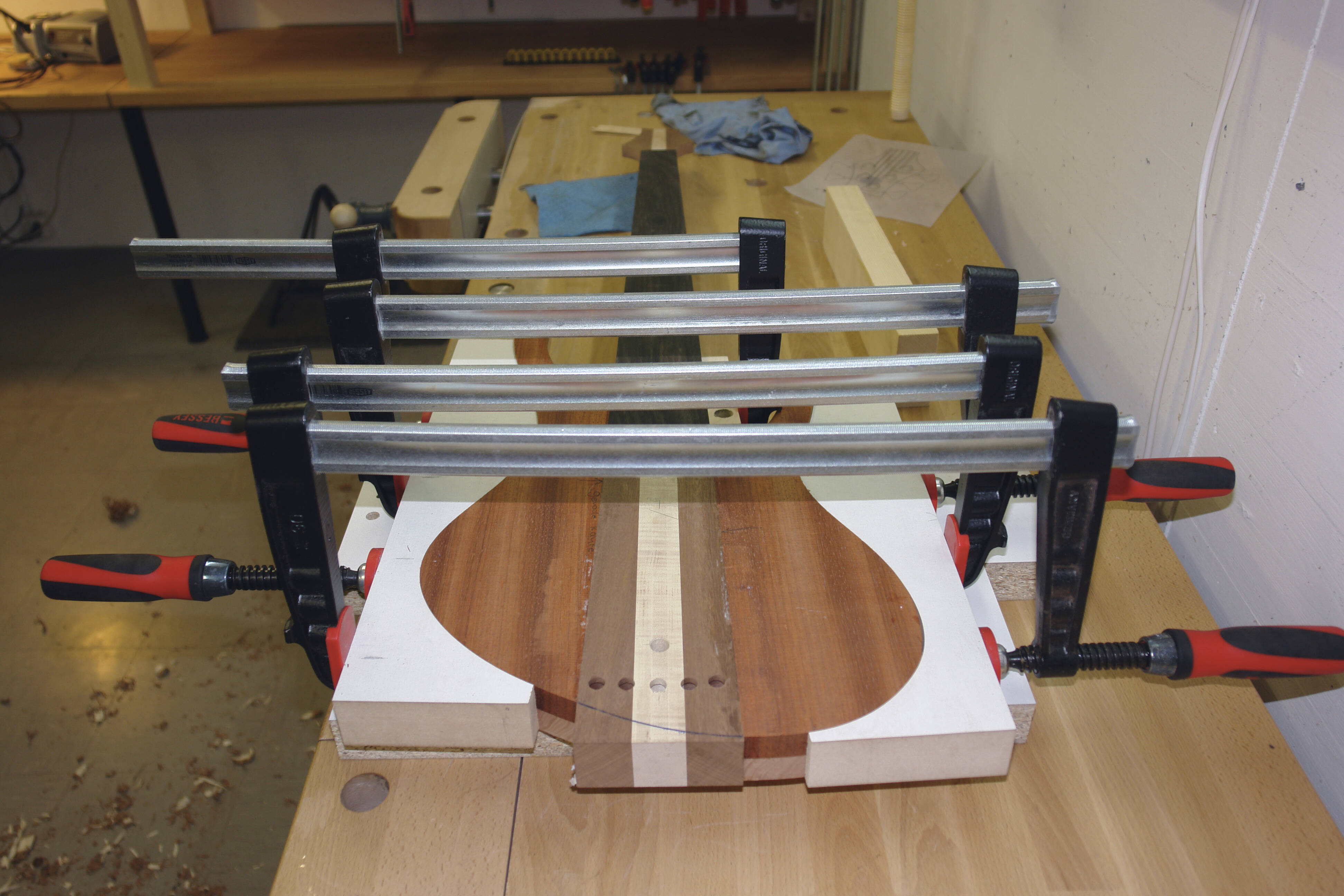 Hier wird der hohle Body in der Dicke zusammengeleimt und gleichzeitig der Hals eingeleimt.