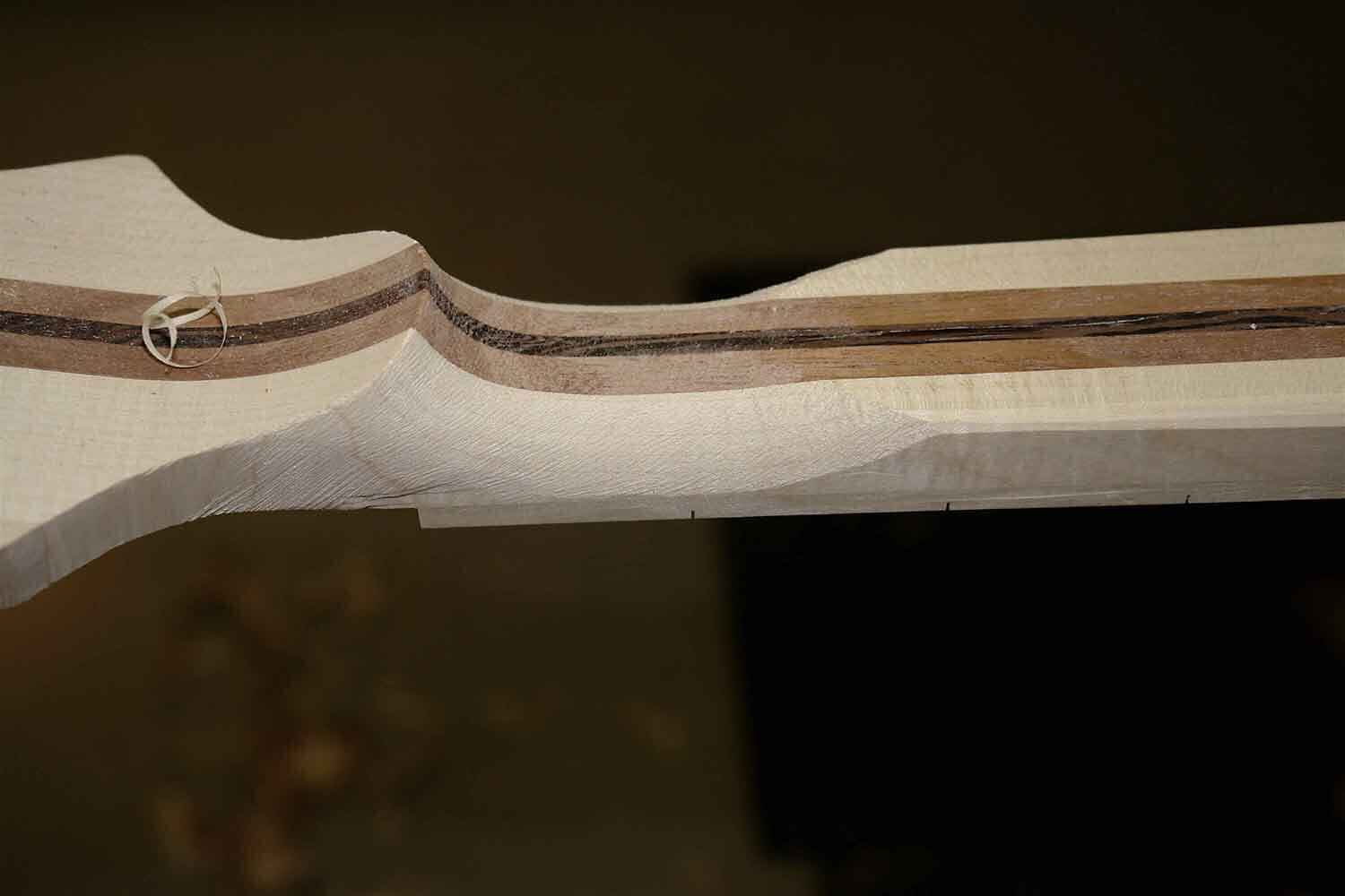 Es ist wichtig, dass die einzelnen Holzstreifen, die zu einem Hals verleimt wurden, präzise gehobelt und kalibriert sind und mit hohem Druck verleimt werden. Die Breite der Leimfläche misst nach dem Fräsen der Carbonstäbe nur noch ca. 2 mm.