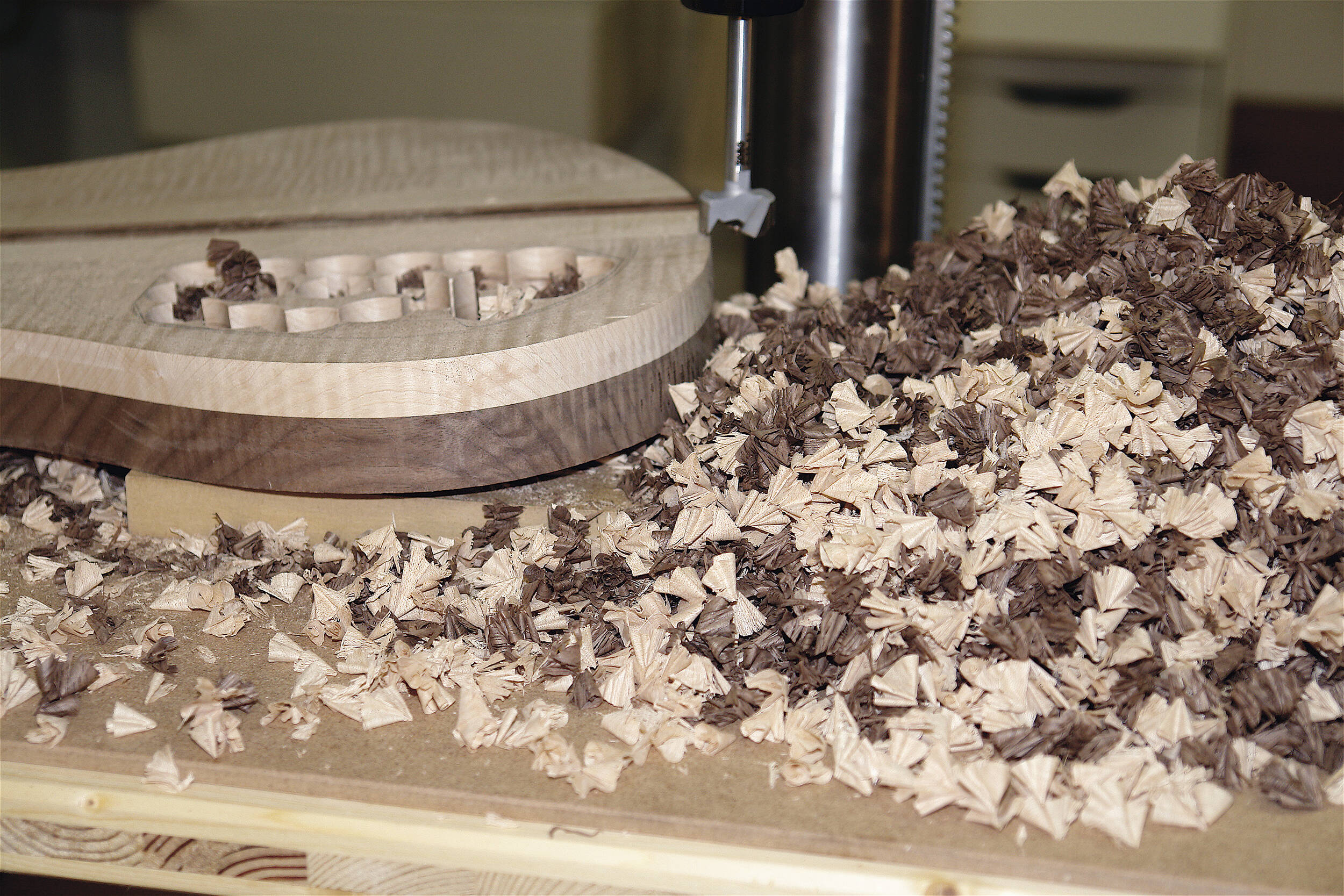 Das Elektronikfach wird vorgebohrt, damit das Ausfräsen einfacher wird. Holzarten: Ahorn, Nussbaum.