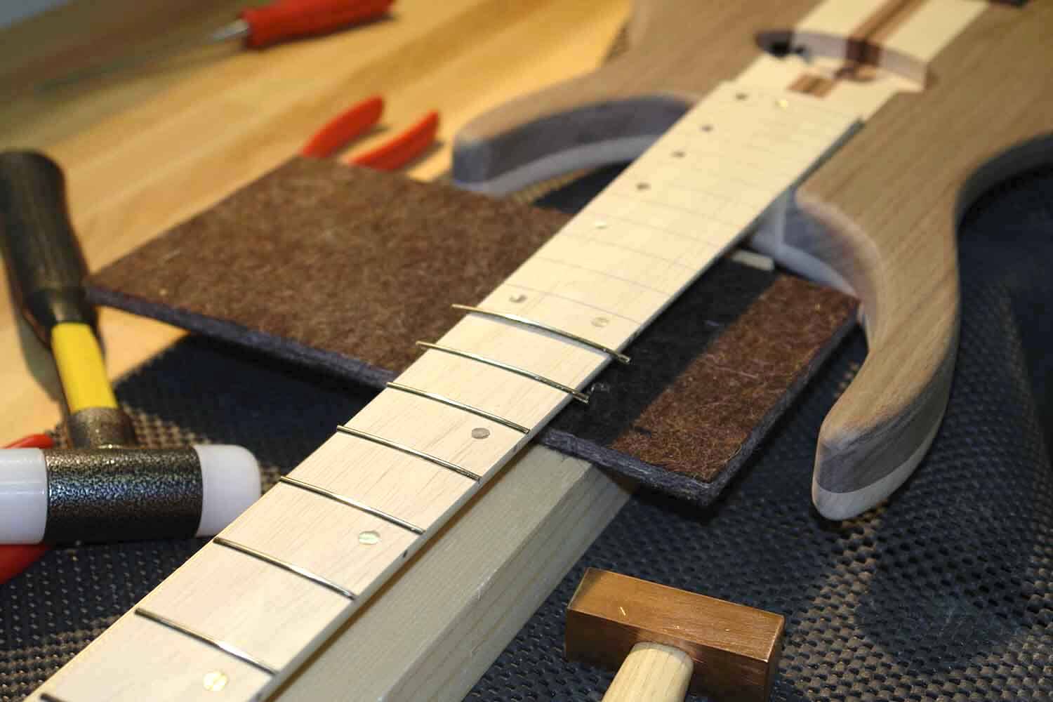Die Bünde werden eingepresst bzw. eingehämmert. Die Breite der Schlitze (0.52 mm) und die Bünde müssen genau zu einander passen, damit sich der Hals nich krümmt. Das äusserst präzise Einsägen der Bundschlitze wird natürlich mit einer sehr genauen Schablone gemacht. Hier zu sehen sind auch die eingeleimten Abalone-Dots.