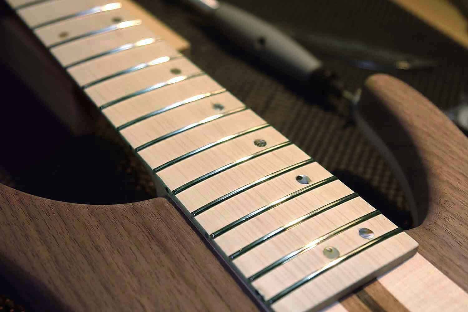 Auf dem Foto sind die fertig polierten Bünde auf dem Griffbrett zu sehen.