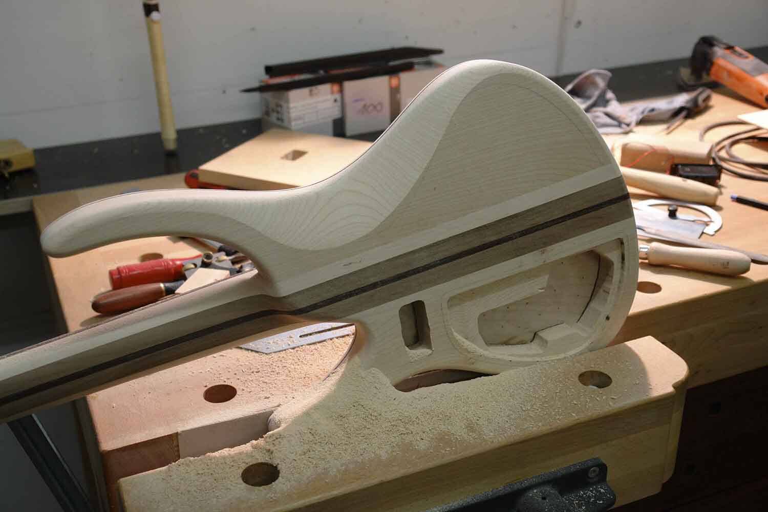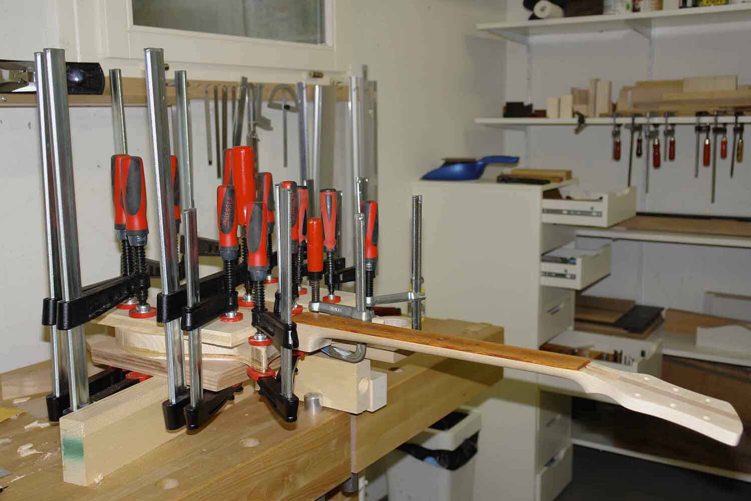 Der Hals an meinen Gitarren und Bässen ist fast immer durchgehend. Dazu brauche ich ein Stück Holz von ca. 45 mm Dicke das 10 cm breit ist. Diesen – meist aus 5 Teilen verleimten – Rohling stelle ich mit grossen Holzbearbeitungsmaschinen her. Alle folgenden Schritte der Herstellung mache ich von «Hand». Natürlich gebrauche ich dabei auch Kleinmaschinen wie Bohrmaschinen, Oberfräsen usw.