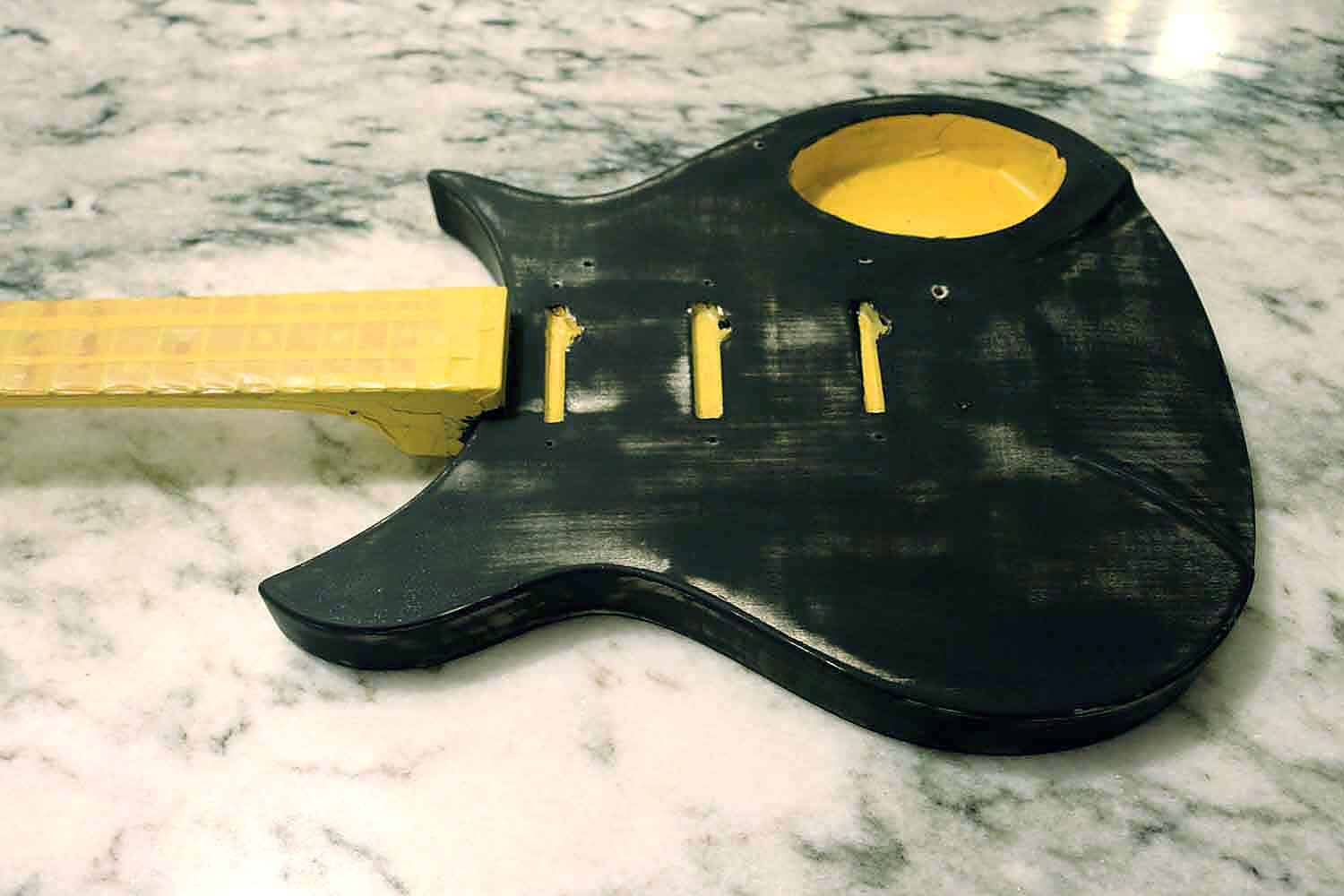 Dieser Gitarrenbody wurde nach der zweiten Grundierung geschliffen und vorbereitet für die Endlackierung.