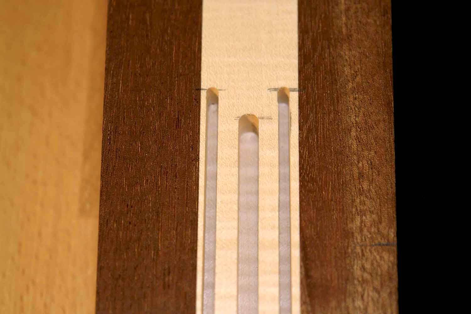 Hier wurden an einem Hals drei Nuten eingefräst. Die zwei äusseren dienen dazu, die Carbonstäbe zur Verstärkung des Halses einzuleimen. In die mittlere Nut wird der Trussrod eingelegt.