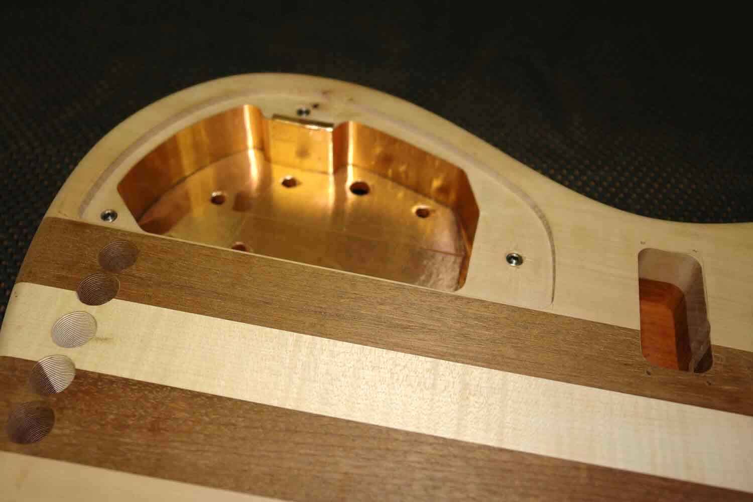 Das Elektronikfach wird mit Kupferfolie ausgekleidet um Brummeinstreuungen durch elektromagnetische Felder zu verhindern. Der Deckel, der das Fach verschliesst, wird natürlich auch mit Kupfer überzogen. So entsteht eine gute Abschirmung.