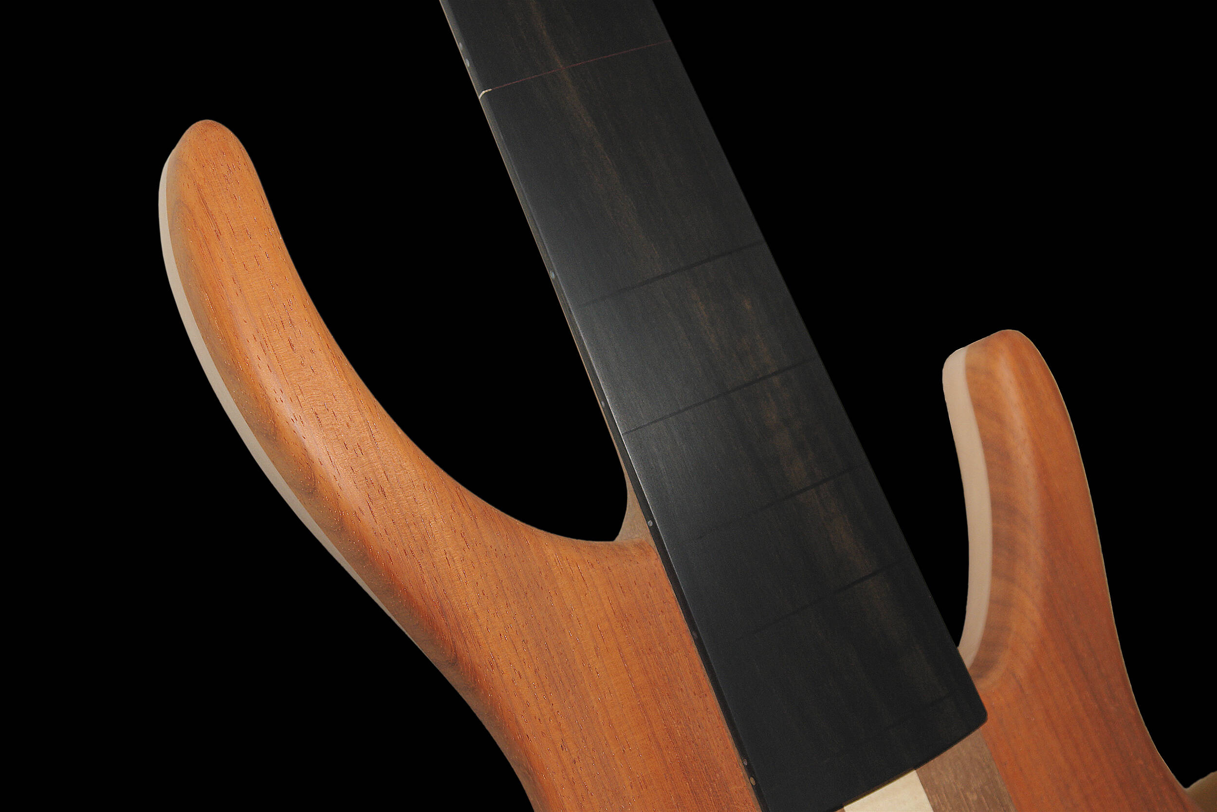 Ein hohler Body vor dem Lackieren. Das rötliche Cocobolo Griffbrett sieht gut aus. Es kann sich aber zusammen mit Schweiss stark verfärben. Das Lackieren des Griffbretts ist bei heiklen Hölzern – wie diesem – und natürlich bei allen hellen Hölzern ratsam.