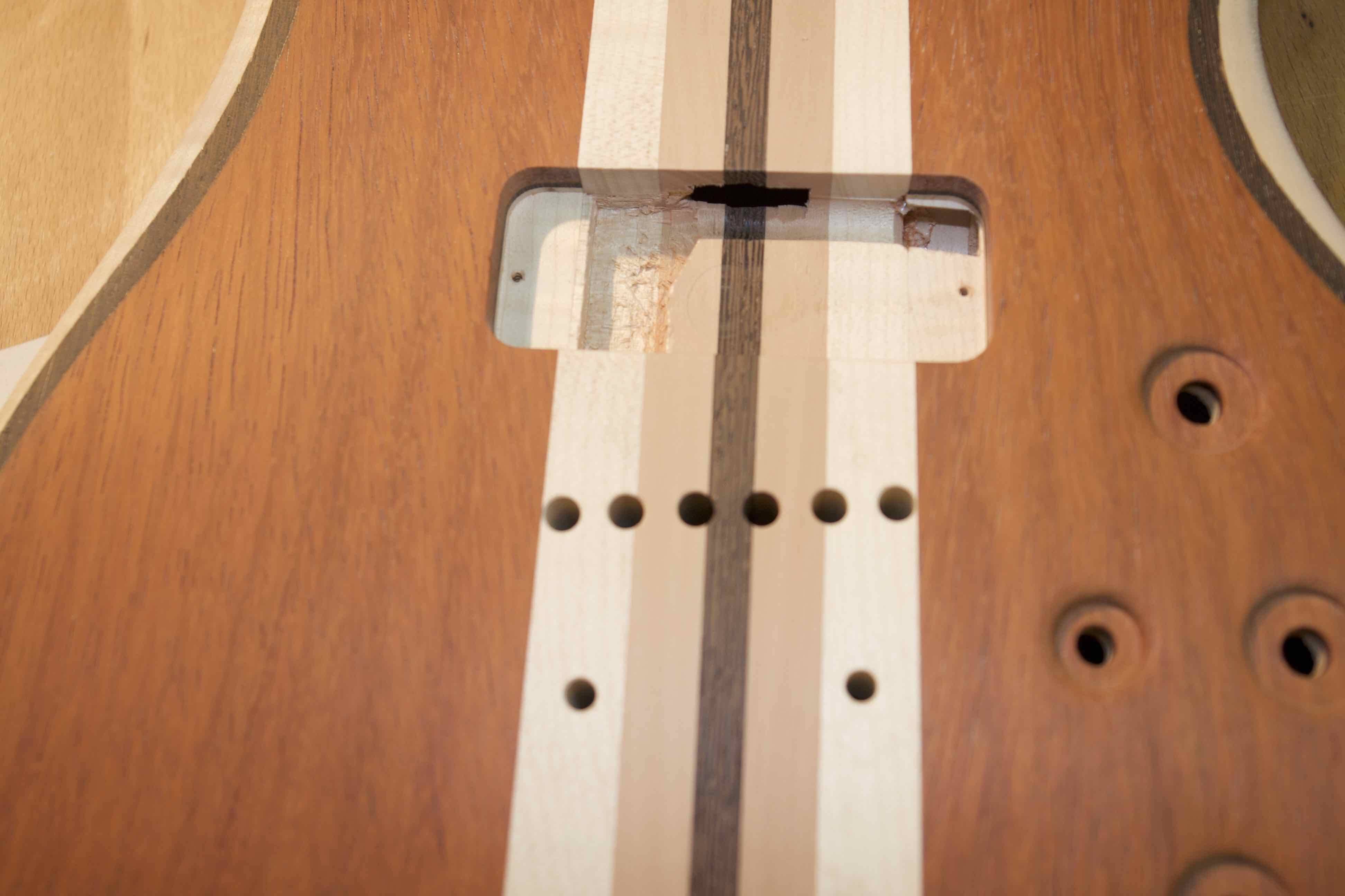 Auf dem Body der Gitarre sieht man die Ausfräsung für einen Pickup und die Bohrungen für den Hannes-Steg von Schaller. Die Löcher auf der rechten Seite sind für die Einstellknöpfe; sie sind leicht eingelassen.