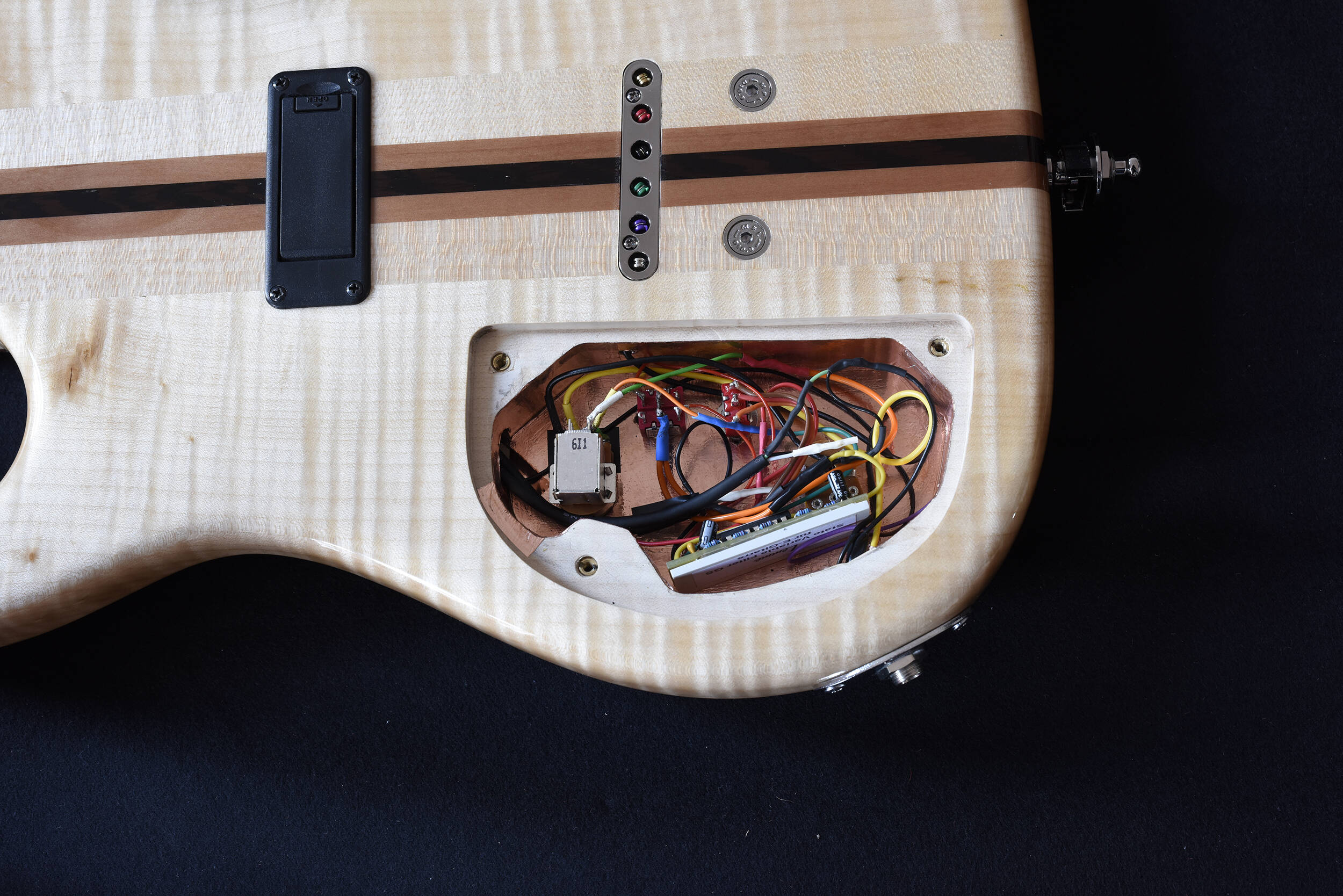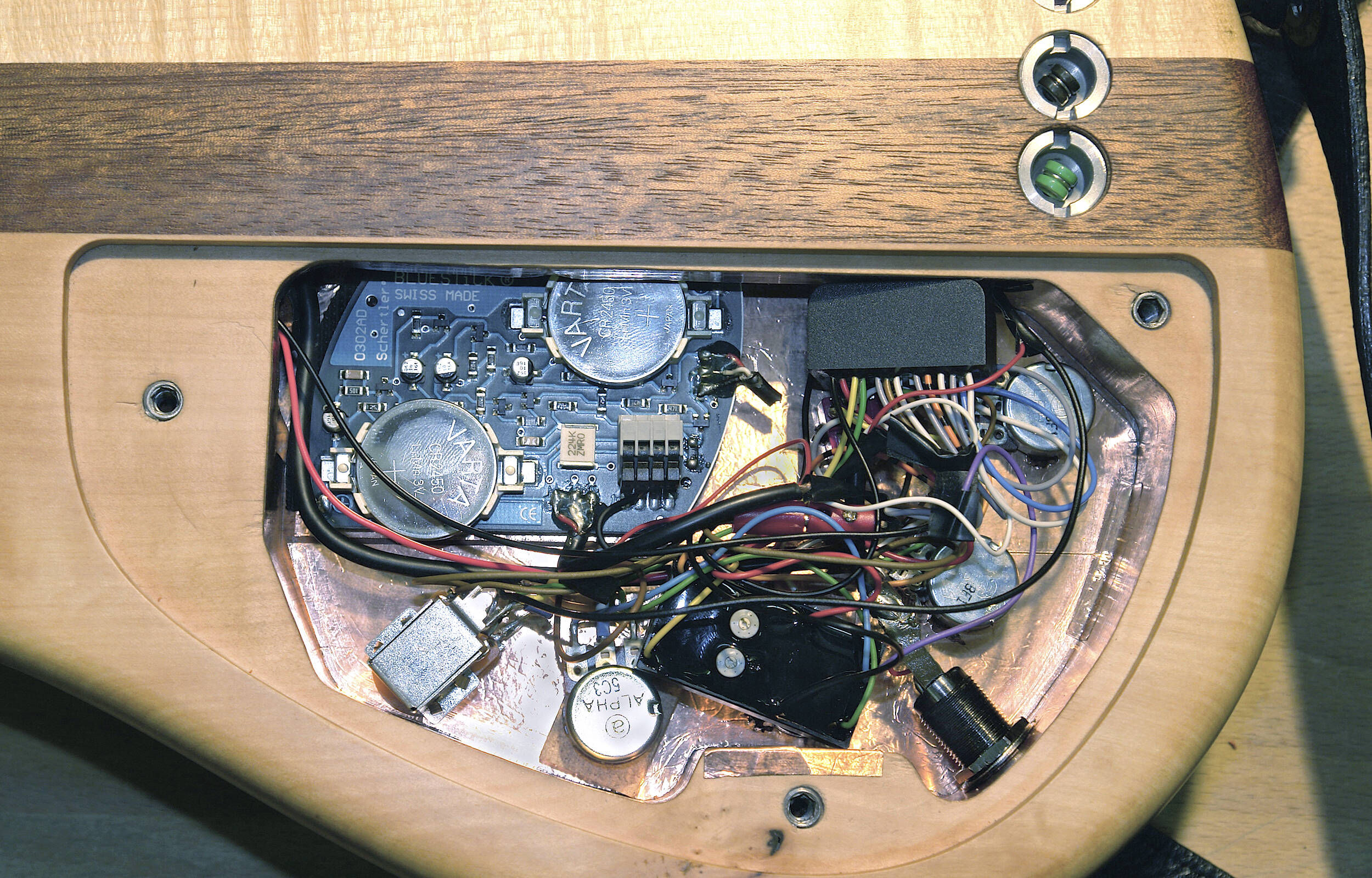 Dies ist ein Elektronikfach mit einer Schertler Bluestick Elektronik, die mit einem Bass Pickup kombiniert wurde. Oben links befindet sich die grüne Platte mit der Elektronik des Bluesticks.