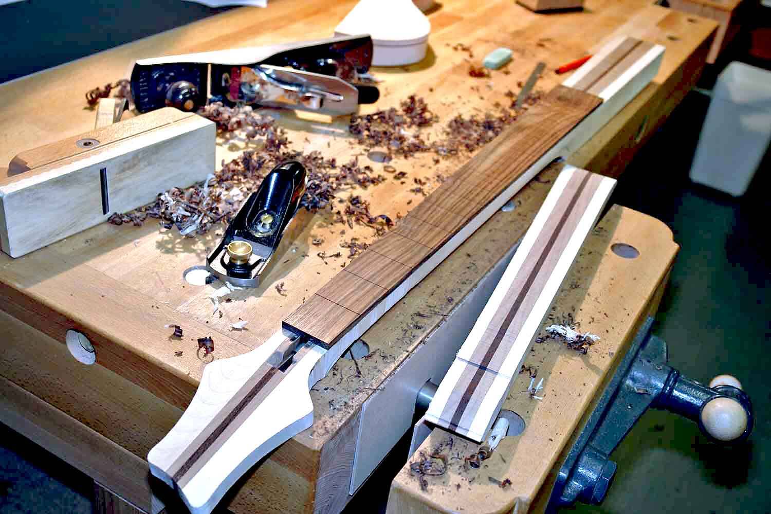 Dieses Hagebuche-Griffbrett hat eine Rundung von 12 Zoll, um das Spielen ergonomischer zu gestalten. Wenn die Rundung von Hand gehobelt wird, braucht man äusserst viel Erfahrung mit dem Handhobel.