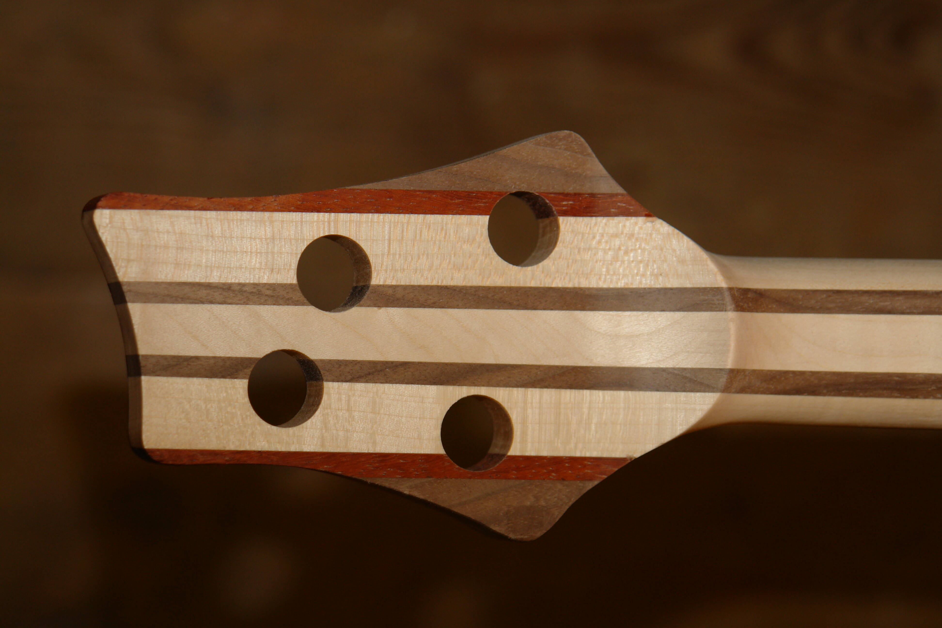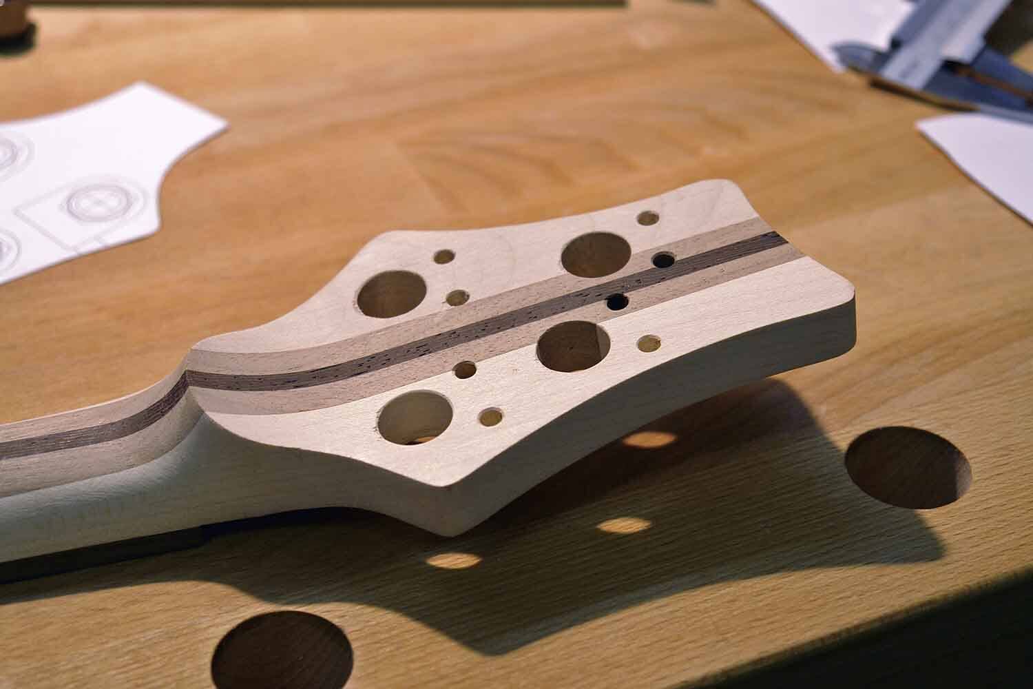 Das Foto zeigt eine fertig geformte und für die Mechaniken gebohrte Kopfplatte.